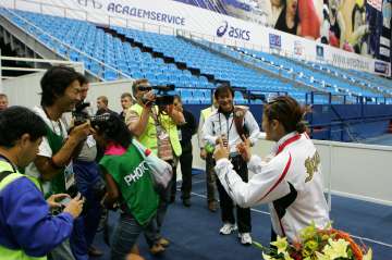2004年アテネ五輪以降の王座を維持するためだけのレスリングから、一転して、「点を取りたくなってきた」と笑う。「今年は63kg級の強い選手は67kg級に出ていたりして、強い選手はいなかった。勉強という意味では、相手より自分のレスリングがどうだったかが大きい。レスリングを新しくして、不安もあったけど、(優勝した事で)来年や五輪の頃にはもっと強くなっていると確信できました」と自信満々だ。こうなった伊調は、もう誰も止める事ができないのではないだろうか(右写真=地元のテレビ局も注目)。