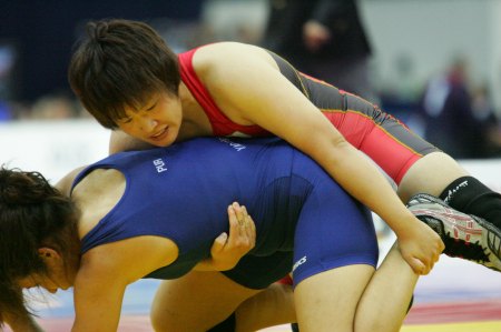 | 第1ピリオド、0−1とされた浜口は中盤にテークダウンで1−1へ。 | 第2ピリオドはクリンチ勝負。攻撃の浜口がテークダウンを決める。 |