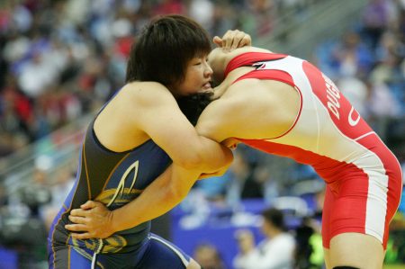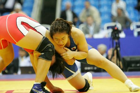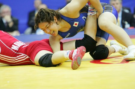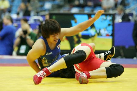 | 67kg級から上がってきた元世界チャンピオンと闘う浜口。 | 0−0の第3ピリオド、ラスト5秒に貴重な1点を取った浜口。 |