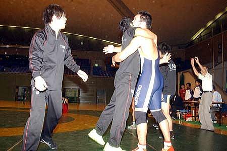 | 3−3で迎えた120kg級。岡(青=拓大)がフォールで勝って優勝決める。 | 勝負を決めた岡と抱き合う須藤元気監督。 |