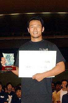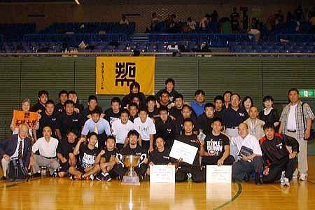 | 激戦を勝ち抜いた選手をたたえる須藤元気監督ほか拓大選手。 | 会場を訪れたOB,保護者とともに。 |