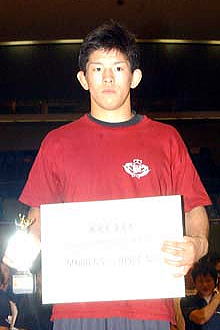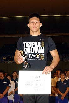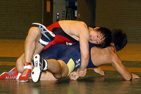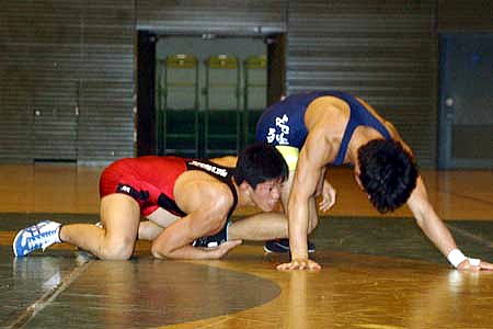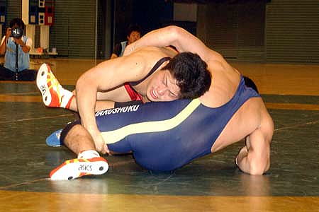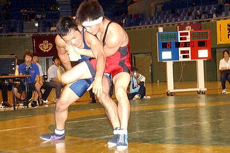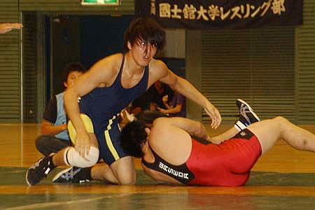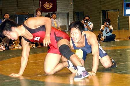 | 1点を先制された高谷(青=拓大)はエビ固めで逆転フォール勝ち。 | 第1ピリオドから攻めた山口(赤=早大)は2−0の快勝。 |