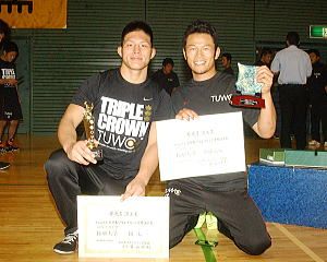 実際に、チームスコア3−3で出番が回ったが、岡は非常に落ち着いており、第1ピリオドであっさりとフォールを奪って快勝。大会一番のヒーローとなり、チームで須藤監督より先に胴上げされた(左写真=須藤監督と岡)。