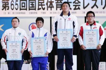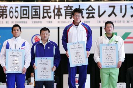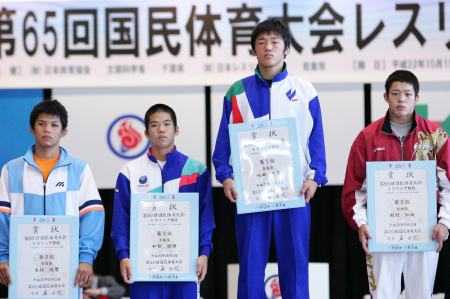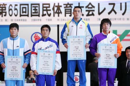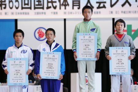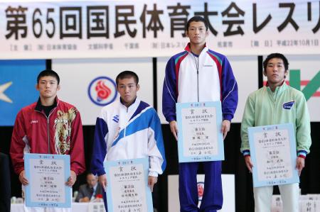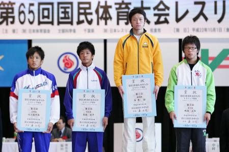 《表彰式》 (左から)3位=伊藤優(長崎・島原)、大久保広斗(鹿児島・鹿屋中央) 優勝=高谷大地(京都・網野)、2位=山崎達哉(東京・自由ヶ丘学園) |