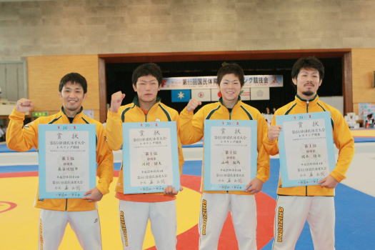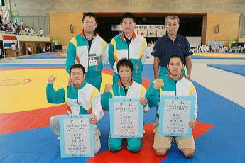 総合2位は、59点を獲得した来年開催地の山口(左写真)。フリースタイル2階級制覇に加えて、グレコローマンでは、世界選手権66s級代表の藤村義(自衛隊)が74s級で優勝。少年55s級の太田忍(柳井学園)が全国高校グレコローマン選手権に続いて今季2冠を達成。成年60s級の谷岡泰幸(自衛隊)も3位に入って点数を稼いだ。
