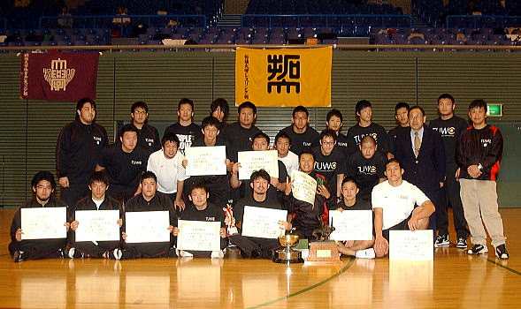 拓大は前日の2階級優勝と合わせて4階級制覇。大学対抗得点で62点をマークし、2年連続8度の優勝を遂げた(左写真=2連覇を達成した拓大)。2位は早大で42点。同大学にとっては、2005年の3位を上回るこの大会最高の成績。出場停止処分が解けて大会復帰を果たした日体大が、優勝はなかったものの31点をマークし、3位に入った。