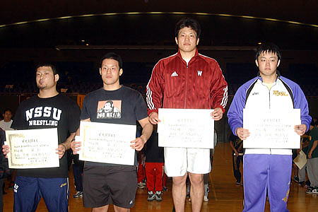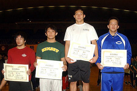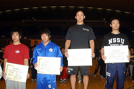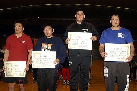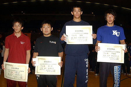 (左から)3位=武富隆(早大)、鈴木聖二(専大)、 優勝=岡太一(拓大)、2位=天野雅之(中大) |