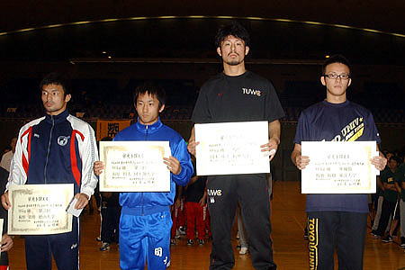 (左から)3位=梅野貴裕(徳山大)、福原将太(国士舘大)、 優勝=岡本佑士(拓大)、2位=牧瀬裕樹(東洋大) |