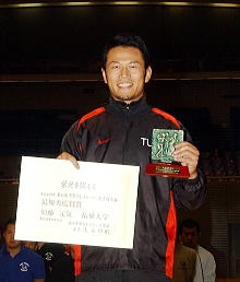 就任2年目にして2年連続三冠王に王手をかけたのは須藤元気監督(右写真)。60s級、66s級、84s級、120s級の4階級を制しての優勝にホクホク顔。もっとも、大会MVPに選ばれた主将の岡本佑士(66kg級)や、インカレ両スタイルに続いての優勝の岡太一(84kg級)など、力の差を見せつけて優勝した選手もいたが、120s級の谷田昇大は決勝でテクニカルポイントなしでの優勝と内容が伴わなかった。須藤監督は「スタンドでポイントを取っていかないとダメ」との反省も忘れない。