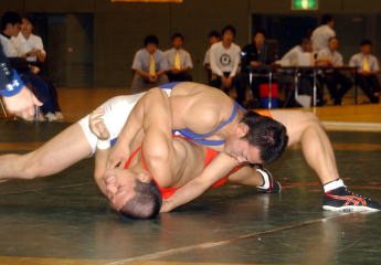 第1ピリオド、スタンドで岡が投げ技を打つが、天野は冷静に反応。逆に岡を押さえ込み、ニアフォールを奪う(左写真=赤が岡)。試合巧者の天野が第1ピリオドを奪ったことで、中大のセコンドからは大声援が沸き起こった。一瞬、静まり返る拓大ベンチだったが、須藤監督は落ち着いていた。「負ける心配はありませんでした。岡が攻めていての失点でしたから大丈夫だと思った」と振り返る。