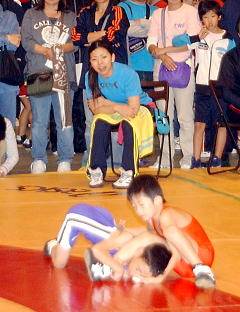 589選手が参加した押立杯関西少年少女選手権。1985年創立と老舗(しにせ)の部類に入る焼津ジュニアの低学年選手の試合に、ひと際目立った女性セコンドの姿が。小学生時代に同クラブでレスリングをやっていた堀江愛子コーチ(右写真)。5年前くらいにコーチに就任。女性特有の優しさで選手をまとめている。