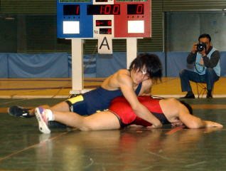 全日本のステップになる今大会では、決勝の舞台で平常心の闘いができた。打倒高谷を胸に、開始早々から突進してきた北村を落ち着いてかわすなど、熱くなりすぎることはなかった。突進してきた北村は自ら場外へ出てしまうなどして自滅。自らタックルを決め(左写真)、鮮やかなカウンターも決めてみせた。この冷静さが全日本で出れば、高谷王子の全日本制覇は見えてくる!