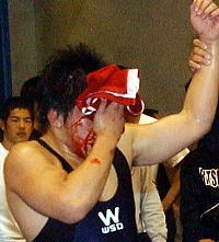 第1ピリオドは辛うじて1−0で勝った。第2ピリオドは0−0でクリンチの攻撃権。相手のタックル返しに遭ったが(左写真)、当初は自分のテークダウンのポイントとされた。しかし相手陣営からのチャレンジ(ビデオチェック要求)。