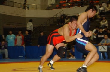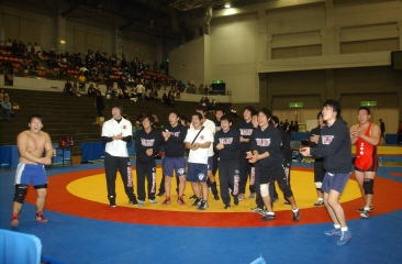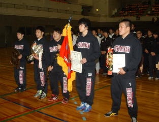 西日本学生レスリングの今年最後の大会、西日本学生秋季リーグ戦は春の覇者・立命館大が予選リーグ3試合と決勝の中京学院大戦を危なげなく勝ち抜き、2シーズン連続18度目の優勝を遂げた(右写真)。春秋制覇は2年ぶり7度目。部員は19人と決して多くないものの、西日本の王者の実力を見せつけた。