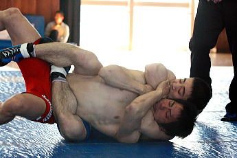 一口に「格闘技」と言っても、様々な競技がある。「その中でもレスリングはキツい競技ですよね」と植松。逆に言うと、レスリングをすることによって、自身の格闘技能力の向上に役に立つという。そのレスリングを取り入れ、関節技も使えるコンバットレスリングは、関節技を得意とする植松にとって、“レスリング”に手軽に取り組める競技のようだ(左写真=得意のスリーパーホールドで勝ち上がった植松)。