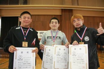 | 優勝したプロ格闘家。左から北岡、植松、秋本。 | 各階級優勝選手。 |