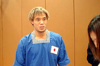 | パンクラチオンのユニホームを着用し、取材を受けるSRCフェザー級王者の金原正徳。 | クラッシュを国技とするウズベキスタンの大使館員。合宿の模様が国営放送でオンエアされるという。 |