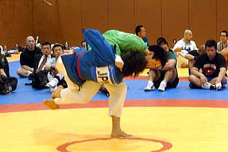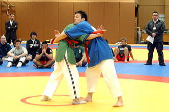 | 【グラップリング】関節技のあるレスリング。ポイントも細かく決められており、ポジション争いが重要。 | 【クラッシュ】柔道に似た格闘技で、足払いなどもある。下半身への手での攻撃は禁止。 |