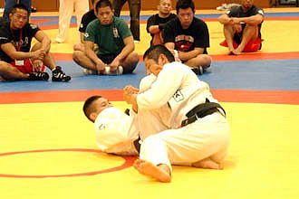 | 【ベルトレスリング】お互いののベルト(帯)を使ってスタート。投げ技が決まって一本。 | 【ブラジリアン柔術】グレイシー一族で有名。投げの一本はなく、寝技での絞め技・関節技で勝負が決まる。 |