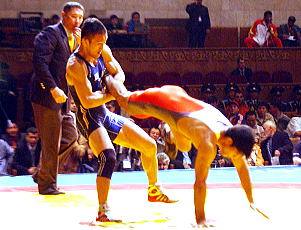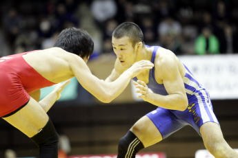 自衛隊の同学年では2006年ドーハ・アジア大会3位の田岡秀規(フリースタイル55kg級)や、2008年全日本選手権2位の谷岡泰幸(グレコローマン60kg級)らは現役続行を決意。「ともに頑張ろうと思っていた」と、退官は自分の本望ではなかった(右写真=2008年全日本選手権決勝で闘う大舘)。