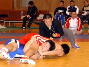 4月からは保健体育の教師が大館のメーンの仕事となり、そのかたわらでレスリング活動を続ける(左写真=自衛隊大会では審判も務めた大舘。今後は教員がメーン)。気になる選手としての活動だが「全日本社会人選手権と国体に出て天皇杯(全日本選手権)の資格は取りたい」と意欲は満々。