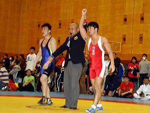 1回戦の相手は優勝候補の「練馬駐屯地」。66kg級には2004年の国体フリースタイル55kg級王者の杉谷武志選手がエントリー。大会屈指の好カードとなった。試合は接戦だったが、やはり右手首の骨折が響いて1−2の判定負け(右写真左が勝目さん)。チームも2−3で敗れ、教え子たちとの闘いは終わった。