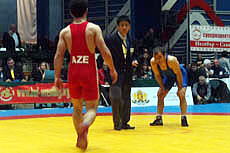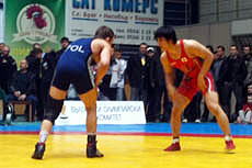 | グレコローマン98kg級で銅メダルを獲得した藤本健治。 | 不可解な判定続きでメダルを逃したフリースタイル66kg級の石田智嗣。 | 2006年フリー55kg級世界王者のベリコフ(ブルガリア=青)を裁く本田原審判員。 |