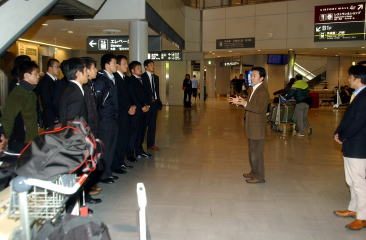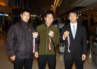 メダルを取った選手は両スタイルとも55kg級と60kg級。アジア・チャンピオンを破っての優勝(湯元進一)など軽量級の踏ん張りには満足そう。先月末のロシアで行われた「ヤリギン国際大会」に参加した米国チームのジ―ク・ジョーンズ監督からも「日本の軽量級はすばらしい」と言われたそうで、「だれが出てもメダルを取れる、という状況になった」と、層が厚くなったことを感じた様子。「ロンドン五輪までには、(世界選手権の)メダルに確実に手が届くようになる」と予測した(右写真=成田空港で選手をねぎらい、今後を期待する佐藤強化委員長)。