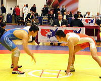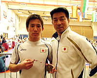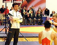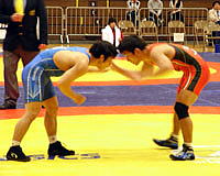 | 金メダル獲得の湯元進一選手(自衛隊)と自衛隊の伊藤広道監督。 | 55kg級決勝で韓国選手と闘う湯元進一(赤)。 | 66kg級3位決定戦で韓国選手と闘う藤本浩平(赤)。 | 84kg級3位決定戦で米国選手と闘う松本真也(赤)。 | 両スタイルの日本チームを指揮した佐藤満強化委員長。 |
