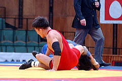 《試合経過》第1ピリオドの序盤、高塚ががぶったあと、わき腹に頭を押しつけてエビ固め狙い。1点を先制。1分25秒にタックルをつぶして1点を加えた。終了間際に1点を取られたが、2−1でこのピリオドを先制。第2ピリオドは、開始早々にがぶって相手のひざ裏をすくってエビ固め。3点と5秒以上押さえた1点が入って4−0。1分15秒にもがぶりから回り込んで1点を取り、5−0とした。