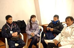 喫茶店で記念撮影をせがまれたアゼルバイジャン選手。渡す機会があるか? かかとの底がはがれたスノーシューズ。パカパカと音がする。 男子の竹内トレーナーと“ロシアの妖精”ナタリア・ゴルツ。 篠原審判員ととモンゴルの女子選手。 「渡せないよ、ゴメンね」といった感じであいさつして外へ。この日は試しに会場まで歩いてみることにした。前日と同じで太陽(ただし、氷河期の太陽のように、どんよりした雲の中に太陽が見える程度。もっとも、氷河期の太陽を見たことはないけど…)が出ているし、暖かい日なんだと思う。歩いて2分後、カメラバッグから帽子を取り出す。エニセイ川の橋を渡り終わるころ(約7〜8分後)、首巻きを出し、月光仮面のように口とほほを覆う。そうしなければ寒くて仕方ない。新潟生まれの筆者だけど、やはり寒さが違う。吹雪いている日は、この日の比(しゃれているわけじゃありません)じゃないだろう。