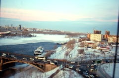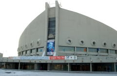 飛行機の窓から見たクラスノヤルスク空港。雪ぼこりが舞い、見るからに寒そうだった。 川の半分近くが凍っていたエニセイ川。全面凍結も珍しくないとか。 男子フリーの1997年世界選手権の会場でもあったイワン・ヤリギン・パレス。 機内が明るくなって、到着(9時20分)が近づいて目を覚ます。すると飛行機がゆらゆらと左右へ揺れている。ジャンボ機が御巣鷹山に落ちて以来、飛行機の安全神話を信じなくなった筆者は、正直言って怖くなった。強風のせいなのか、操縦士の技術が未熟からなのかは分からないが、かなり揺れて、時に左にある壁に頭をぶつけそうになるくらい。