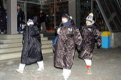 午後10時すぎ、やっと全試合が終了。比較的天気のいい日で、昼間にロビーから見えた外は太陽が見えてもいましたが、この時間の外はマイナス20度を下回っているでしょう。バスに乗り遅れて徒歩で帰ることになっては、凍え死ぬことも予想されるので、すばやく荷物をまとめていると、篠原正樹審判員が「こっちです」と迎えに来てくれた。外へ出ると、確かに寒い! 1分ならいることはできて、2分は厳しい! 3分以上になったら、体が動かなくなるかもしれない。