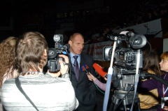 2面マットの練習場。この10数分後には200人を超える選手が汗を流し、満員電車並みの混雑になりました。 3面マットの会場。出場選手数からして、スケジュールの遅れが懸念された。 出現した世界のスーパースターを、地元のマスコミがなかなか離さなかった。