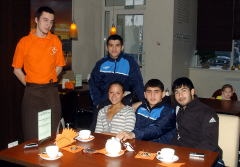 午前セッションは2時半近くに終了(それでも予定の1時間半オーバー)。ホテルへ帰って昼食、執筆、喫茶店で記事のアップとこなす。喫茶店ではクラスノヤルスクまで一緒だった(と思われる)アゼルバイジャンの選手がたむろしていた。カメラを持っていたからだろう、「撮ってくれ」とのこと。「仕方ない、撮ってやるか」と思い、撮影し、「送るからメールアドレスを教えて」とジェスチャアで伝えたが。「持っていない」」とのこと。じゃあ、何のために撮ってくれって頼んできたの? どうやって、この写真を渡すの? ポラロイドカメラじゃないんだよ。