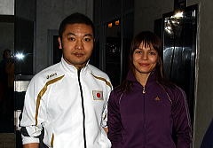 試合はきのうよりやや早く終わり、10時前にはホテルで食事スタート。選手はミーティングがあるので、私と篠原審判員が先にレストランへ。すると私たちの席のそばに、あのナタリア・ゴルツ(ロシア)がやってきた(「あの」というのは、説明無用という意味ですよ!)。篠原審判員が2ショット写真を撮りたがっていたので、筆者がシャッターを押す。