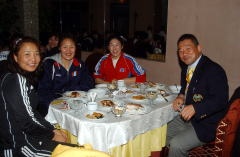 結局、私たちのテーブルにはモンゴルの女子選手が来ました。せっかっくだから、何らかのコミュニケーションをとりたかったが、英語が全然話せない。「アサショウリュウ、ハクホウ、ハルマフジ」と言ったら、彼らの本名を教えてくれたりして、少しは会話ができた。いま、朝青龍が暴力事件で問題になっていること、知っているのかな?