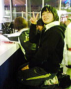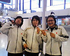 | 空港駅からターミナルFへの道は、まだ工事中で、メーンゲートは閉鎖中。左の工事用の出入り口を通って空港へ。 | 純日本女性の甲斐選手は、空港のカウンターバーでも正座して食事。 | 最年長の山本聖子選手が優勝賞金で化粧品をチームメートにプレゼント(新海選手が写っていませんが、もらってます) |