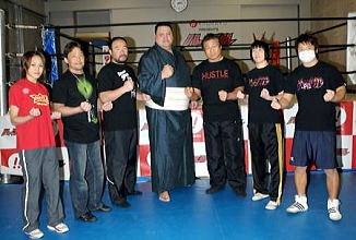 「ハッスル」には、高田延彦扮する高田総裁のほか、小川直也、川田利明、ボノ(元横綱曙)、長州力、天龍、坂田亘といったプロレスラー、タレントのインリン扮するインリン様、時に狂言師の和泉元彌や元読売巨人軍のウォーレン・クロマティなども参加した団体。プロレス入り直後を「周りは憧れていた選手ばかり。現実とは思えなかった。夢があふれていて楽しい日でした」と振り返る(右写真:曙=中央=らとともに。右から2人目がバンザイチエ)。
