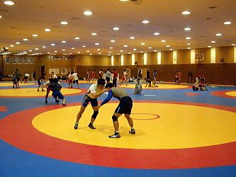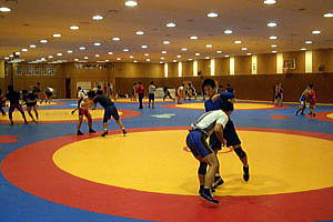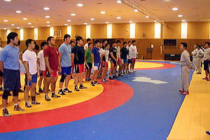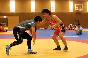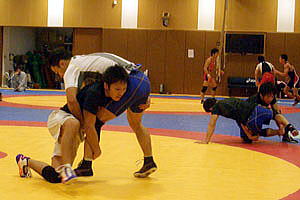 | フリースタイル・チームを指導する佐藤満強化委員長(専大教)。 | 全日本王者を相手にする森下崇史(左)と全日本2位と闘う高橋侑希(右)の高校生選手。。 | 佐藤強化委員長の見つめる中、フリー60kg級全日本王者の小田裕之(右)と2位の高塚紀行が闘う。 |