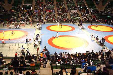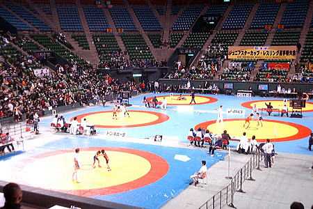 | レスリングでは初めて使用する体育館。5面マットで、将来の日本レスリング界をい背負う610人の小中学生の熱戦が繰り広げられた。 | |