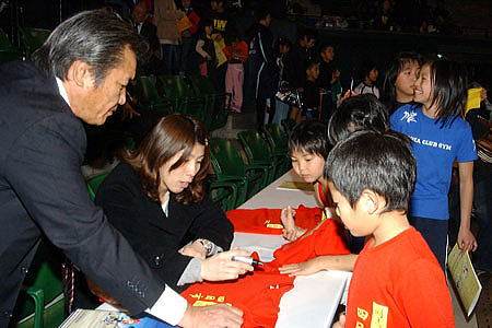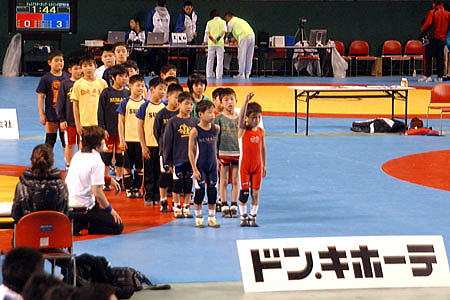 | 愛知県から駆け付けてくれた五輪金メダリスト、吉田沙保里選手に、少年少女選手はサインの列。 | キッズの試合でも決勝戦の前に選手紹介。選手のモチベーションの高揚に一役かった。 |