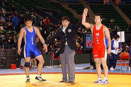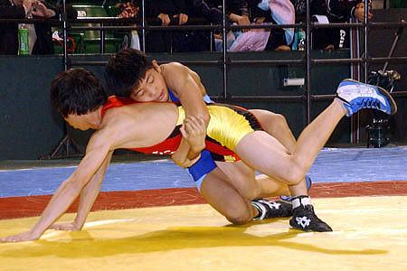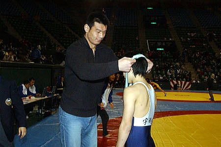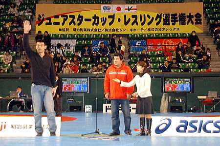 | プロ格闘技イベント「戦極」への参戦を表明している中国の男子グレコローマン120kg級北京五輪代表、身長202cmのリュウ・デリ選手。中国ではキッズ・レスリングはないそうで、子供たちのレスリングに「新鮮な感動を感じた」と話した。この大会を観戦したあと、さいたまスーパーアリーナでの「Dynamite!!」へ向かい、リング上から選手に花束を渡した。 | |