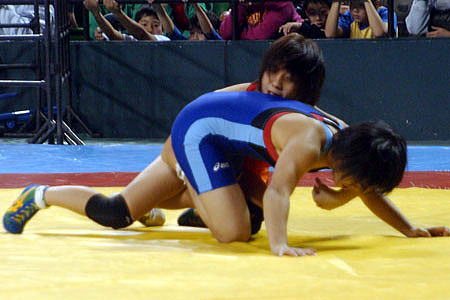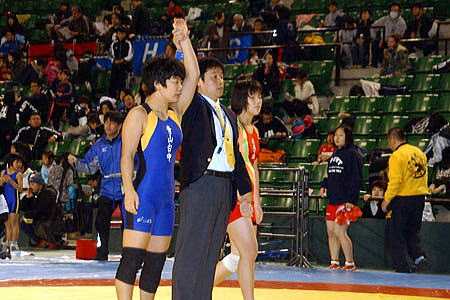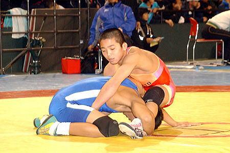 | 中学女子46kg級は、全国中学生選手権チャンピオンの宮原優(赤=JOCアカデミー)が勝つ。 | 全国中学生連盟の年間MVP選手の坂野結衣(青=吹田市民教室)が全国大会52kg級に続いて58kg級を制す。 |