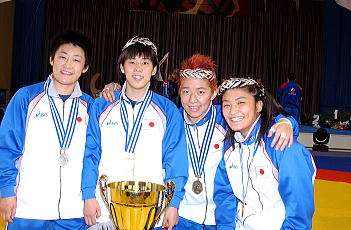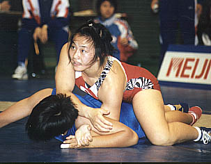 1996年に栄監督が指揮することになった中京女大は、坂本涼子以来、全日本チャンピオンがいなかった。それでも杉山氏のつくったベースに栄監督の指導手腕が加わり、沢田千恵(56kg級)、辻結花(51kg級)ら全日本の2位、3位に入る選手が出てくれた。栄監督は沢田をアジア・チャンピオンへ(正確にはアジア国際トーナメント優勝=右写真)、大学からレスリングを始めた辻をキッズからのエリート選手だった山本聖子を破るまでにそれぞれ育成し、京樽で見せていた指導者としての実力をここでも発揮し始めた。