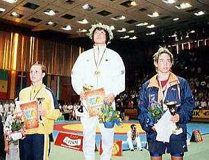 坂本が全日本チャンピオンに輝いた1999年は、それ以前に宮本知恵が全日本チャンピオンになって世界選手権に出場し、岩間怜那が世界ジュニア選手権で優勝と、栄体制が開花し始めた年だった。翌2000年は世界選手権で坂本が金メダル(右写真)、岩間が銀メダル、宮本が銅メダルをそれぞれ獲得。全盛期を迎えることになった。
