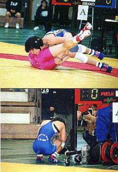 坂本の階級には、世界一になった山本聖子は56kg級にアップしたものの、前年の世界チャンピオンの篠村敦子がいて、坂本が「10回くらい闘って1度も勝っていない」と言う1年下の伊調千春(当時京都・網野高)がいた。しかし栄監督は試合前、記者席で筆者にはっきりと言い切った。「51kg級は日登美が勝つからね」−。その言葉は、翌日(当時は1回戦から決勝を2日かけていた)、見事に現実のものとなった。坂本は準決勝で篠村を3−0で破り、決勝で伊調に4−3で勝ち、全日本選手権初出場初優勝を遂げたのだった(左写真:伊調と闘う坂本=上、初優勝しマットサイドで感激に浸る=下)。