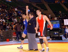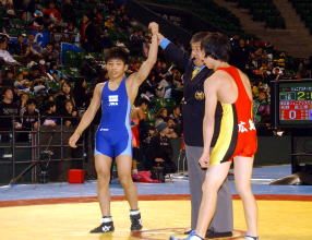 全国中学生選手権73kg級チャンピオンの和智健悟(霞ヶ浦アンジュ)との決勝では、明らかにその疲れが見え、第1ピリオドを1−1のラストポイントで勝ったものの、肩で息をしていたのは白井の方。先が不安視される内容だった。しかし第2ピリオドが始まると、周囲の不安を吹き飛ばす粘りを見せ3−1で快勝。「焦ることなく闘うことができた。(1階級上のチャンピオンを破ったことは)自信になる」と振り返った。