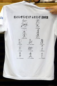 Tシャツは、表に「サポート オリンピック レスリング」とシンプルなデザイン。裏面には、同会を全面的に応援してくれます2012年ロンドン五輪レスリング全代表選手のサインのプリント付きと、プリントなしの両方があります。Tシャツはアシックス製です。